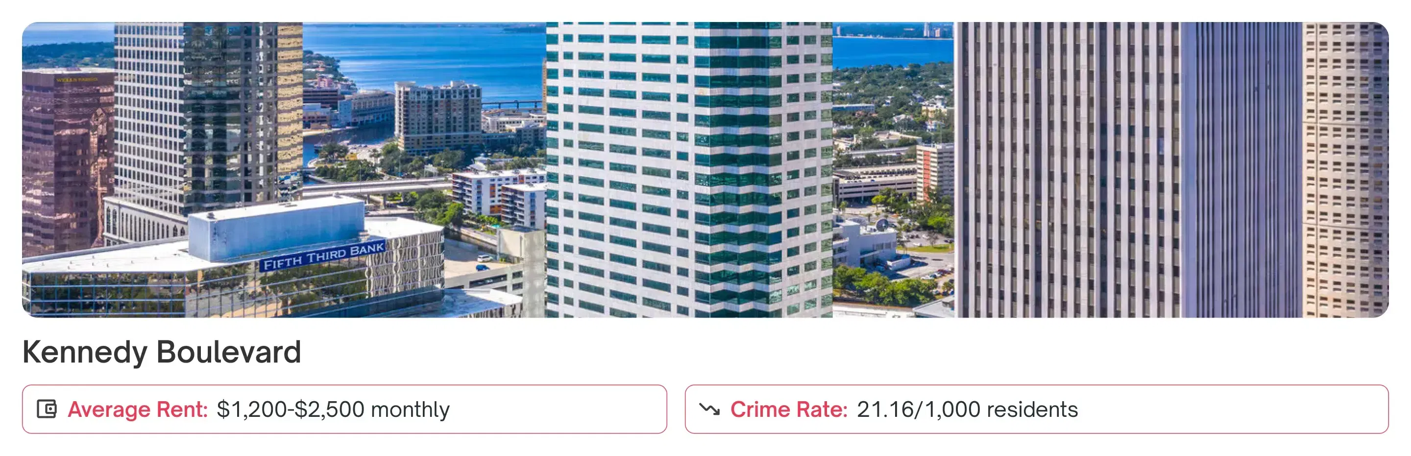 If you seek a neighborhood with ample recreational spaces and cultural centers, Kennedy Boulevard is just for you. This historic location connects downtown Tampa to the western suburbs, also within walking distance of the University of Tampa.