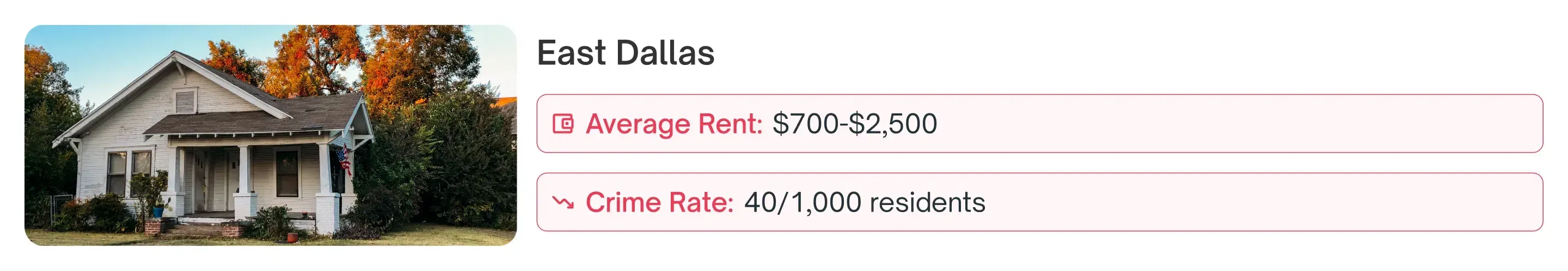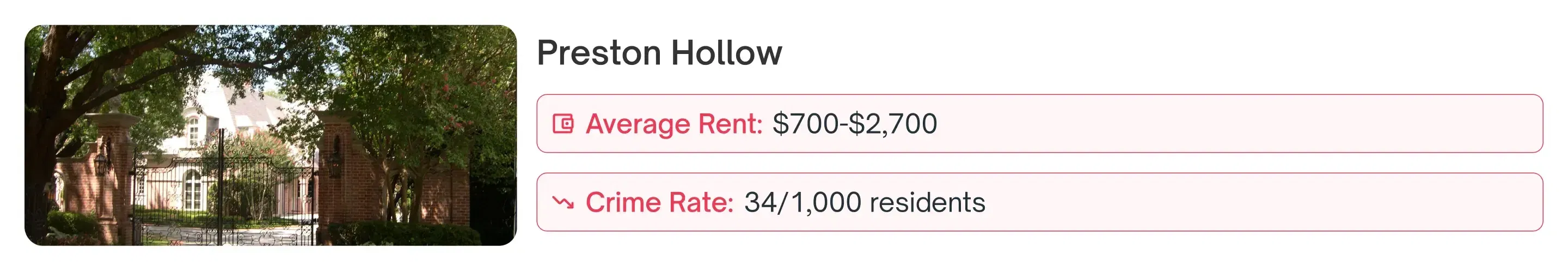 So, where should you plant your roots in the Big D? Here are the 7 best areas to live in Dallas that bring a little bit of that signature Texas charm: [Note that the crime rates have been expressed in terms of the number of crimes reported per 1000 residents in each neighborhood.]