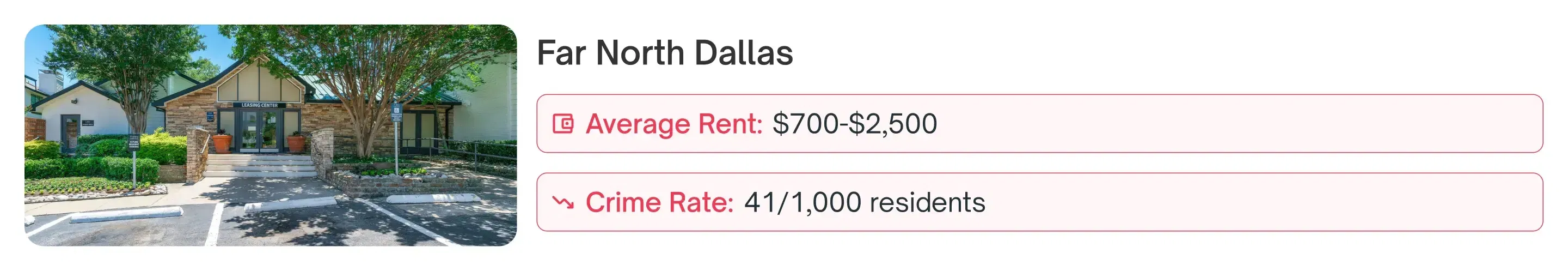 Far North Dallas is a suburb of Dallas TX that’s located to the north of the Lyndon B. Johnson freeway. Apart from this, the region offers efficient connectivity to major freeways, including the I-75 and I-35, which makes it easy for residents to commute to other parts of the city, including downtown. It is also considered favorable for students owing to the range of social infrastructure in the region, which supports the demand for student housing in Far North Dallas. These include schools such as North Dallas High School and Dallas ISD, and parks like Vitruvian Park and Mary Heads Carter Park.