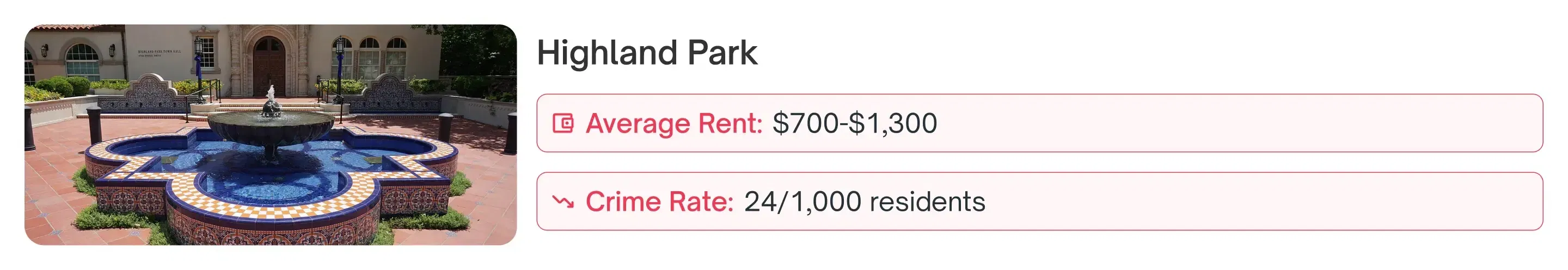 Here’s another bustling suburb located in northern Dallas, known for its mix of commercial, residential, and green spaces, making it a great option for someone searching for the best area to live in Dallas Texas, especially if you’re on the lookout for convenient student housing in Addison. What’s more, the region has a high bike score and walk score, which suggests that it’s easy to commute by bicycle or get around on foot. As for educational facilities near the neighborhood, there are many notable institutions, including Texas Christian University, UTD, Dallas Baptist University, and SMU.