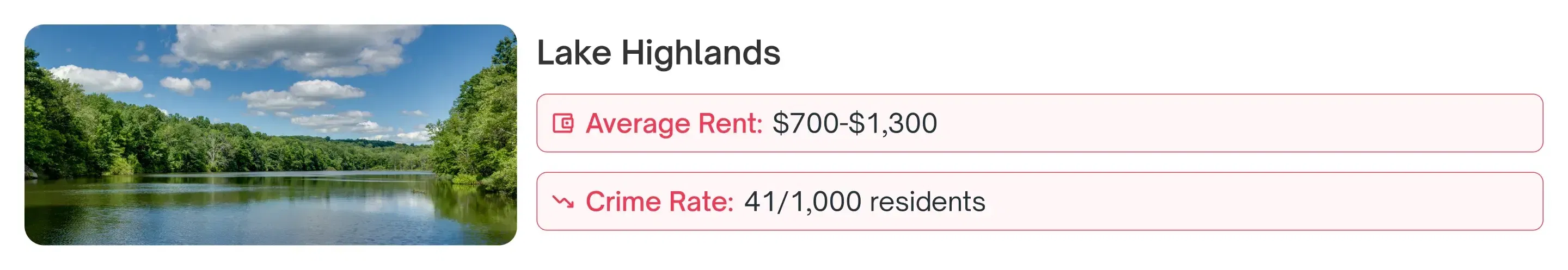 Regarded as arguably the best area in Dallas to live, Lake Highlands is known for its proximity to the White Rock Lake and the rolling hills that create a picturesque environment. Also, the Richardson Independent School District within Lake Highlands houses a number of prominent schools, including Forest Meadow Middle School and Lake Highlands High School. The other educational amenities offered include SMU, UTD, and Richland College, all of which contribute to the growing demand for student housing in Lake Highlands.