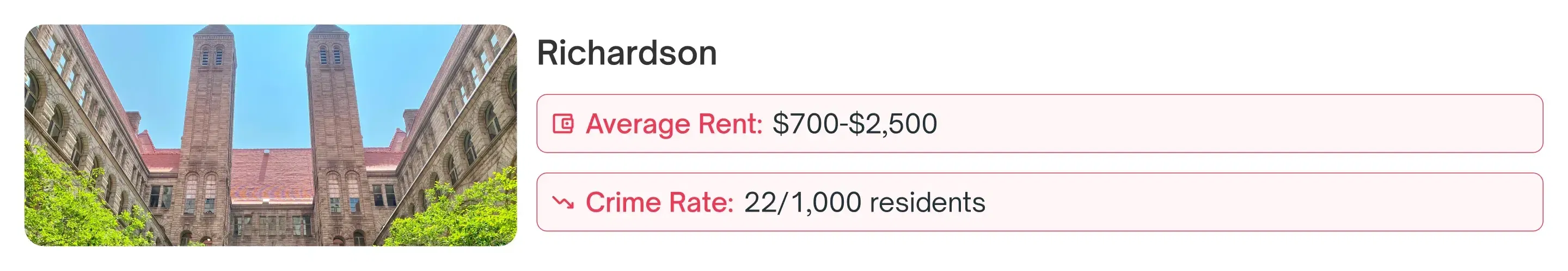 Wrapping it all up with this thriving suburb in TX that offers efficient accessibility to the city via highways such as US-75 and the President George Bush Turnpike: Richardson. As for educational opportunities, the region has several universities located nearby, including UT Dallas, the Chicago School of Professional Psychology, and the University of Dallas, making it a popular choice for student housing in Richardson.