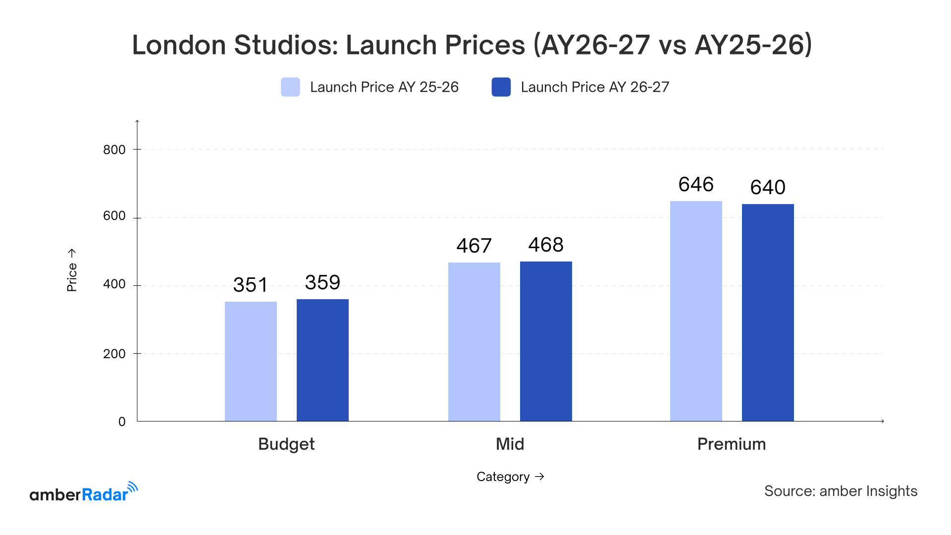 - Mid-range Studios: ▲ +0.21% YoY increase in AY 2026-27 compared to Launch Prices for AY 2025-26.