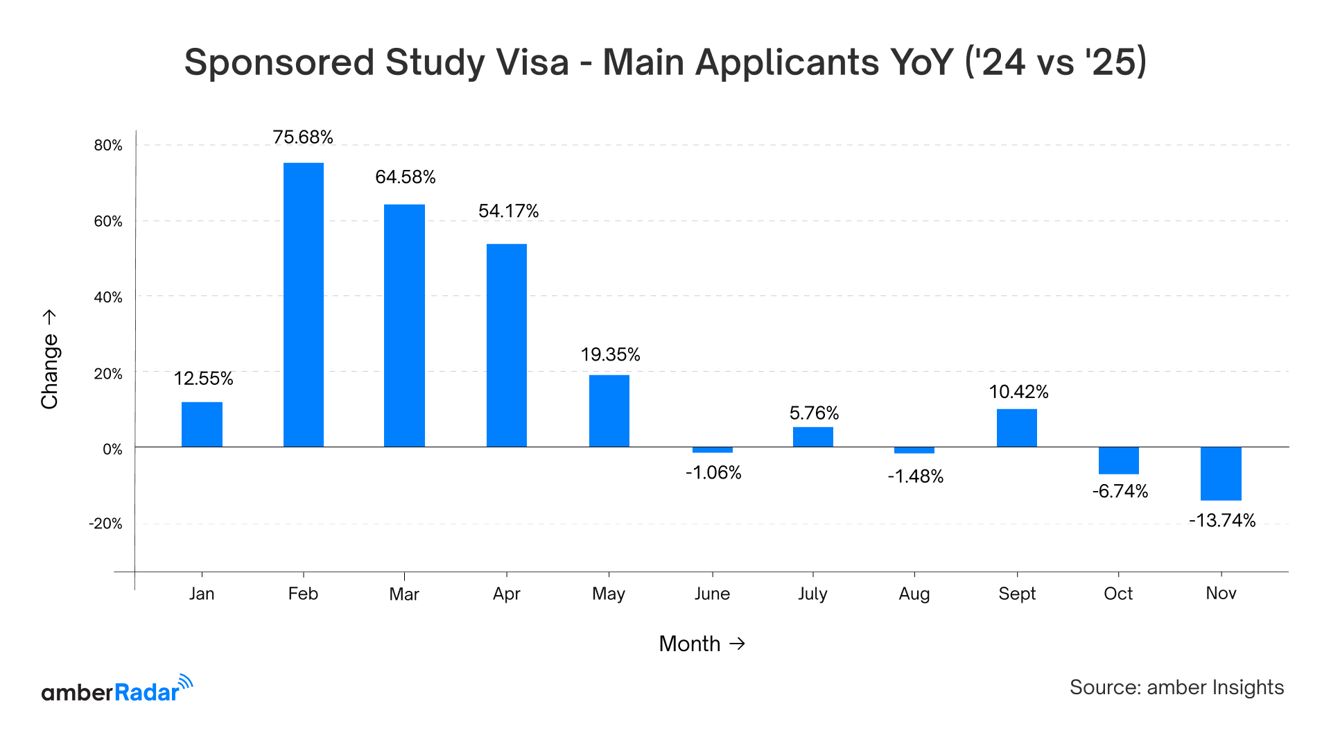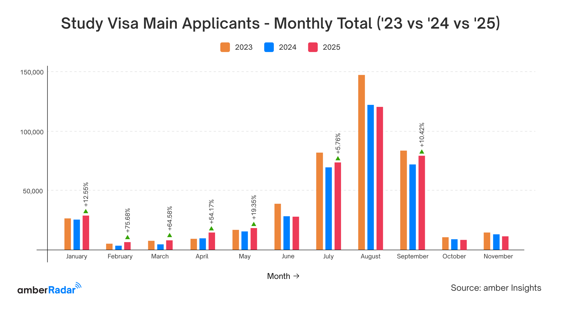 - Overall, student visas for main applicants increased by +6.52% in Jan-Nov 2025 vs last year.