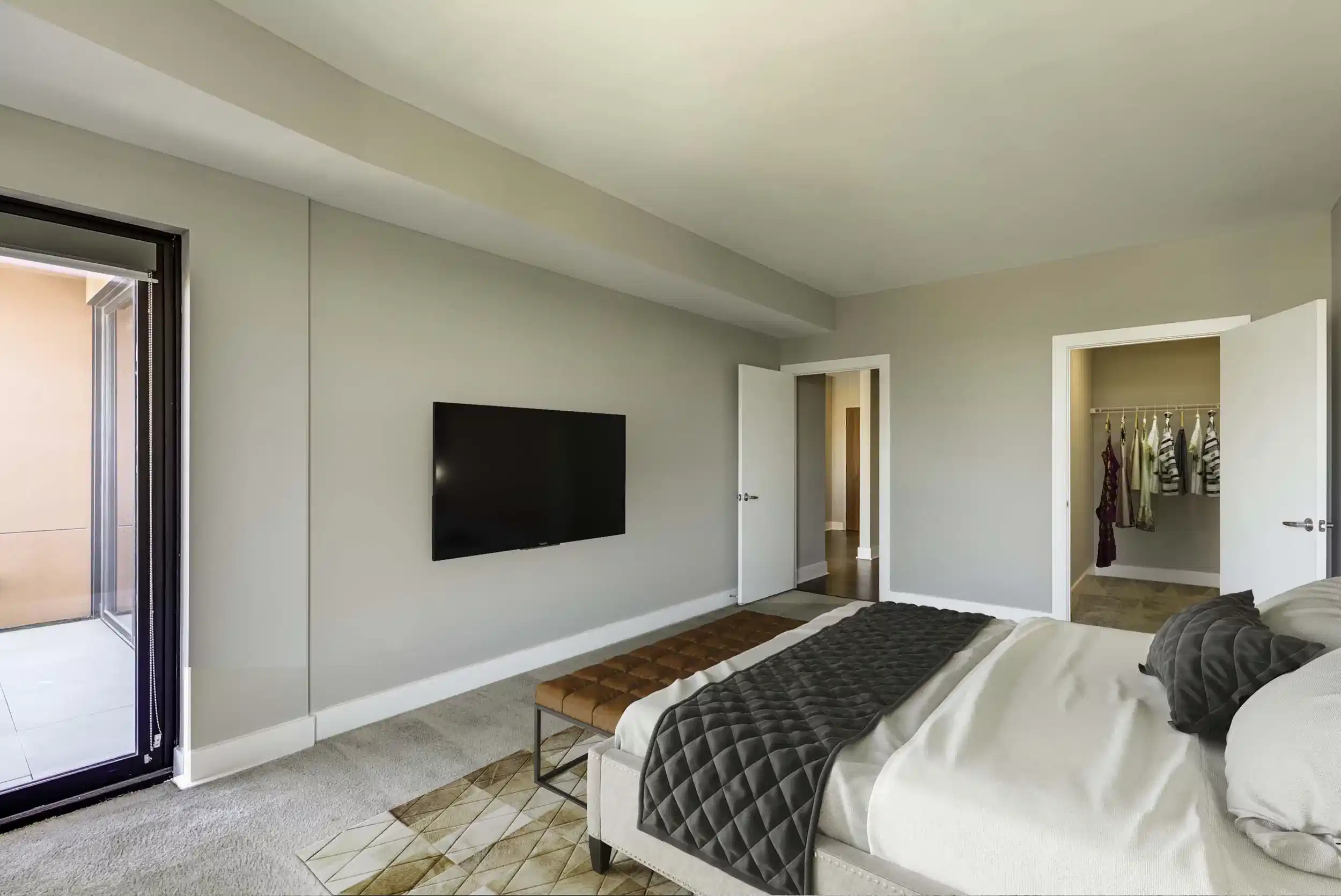 Choosing 250 High Columbus student housing gives learners many room options to fit their needs. You can choose from rooms like Penthouse No. 17 - Private Room, Flat No. 91 - Private Room, or Residence No. 60 - Private Room. Each space includes modern room features. Relax on your private balcony, cook in a kitchen with stainless steel appliances and quartz countertops, and keep your clothes organized in large walk-in closets. Doing laundry is easy with an in-unit washer and dryer. Stay comfortable with a Nest thermostat and enjoy sunlight through floor-to-ceiling windows.