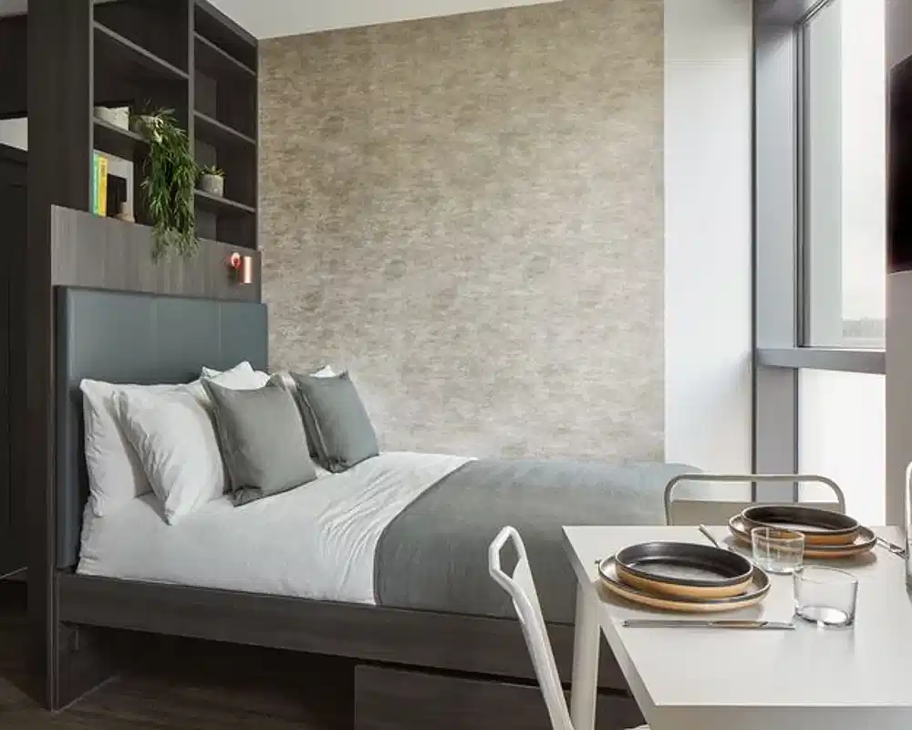Situated at 20 Crossharbour Plaza, London, E14 9YF, ARK Canary Wharf is a contemporary and luxurious choice for student accommodation in London. Designed with students in mind, these stylish studio apartments blend the calm of private living with the liveliness of a thriving community. With just a 3-minute walk to SP Jain School of Global Management and a 5-minute drive to the University of Sunderland, the location is ideal for students who want both convenience and sophistication.
