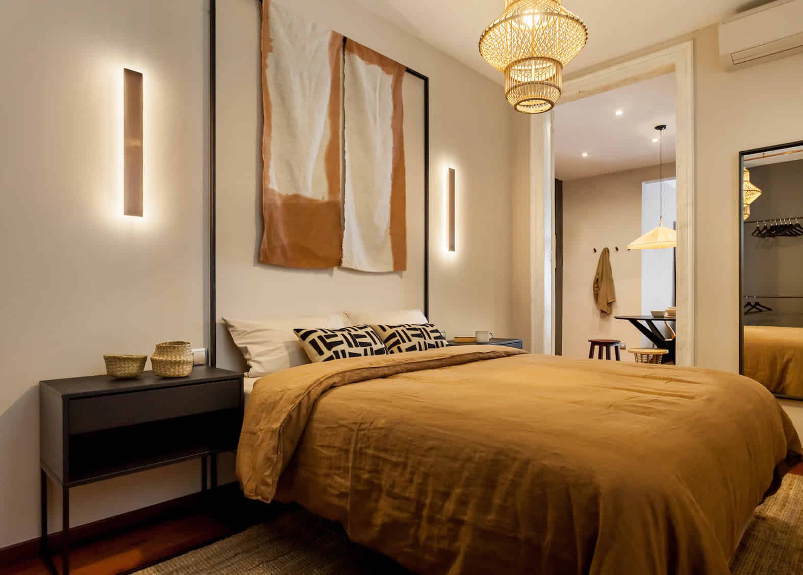 The apartment comes with everything you might need and more! From high-speed internet to the smart TV in the well-furnished living area, it is convenient in each aspect. It has a master bedroom with a large comfortable bed with ample storage and a closet decorated with original hand-painted fabric hangings. The patio has been transformed into a dedicated work area, that has a beautifully designed facing the windows giving a majestic view. In addition, you will get access to the private rooftop terrace, right about the apartment space furnished with a dining table as well as a lounge area with pouffs and a hammock. The bathroom is more like a resort one. And the kitchen is just ready to cook the best meals of your life filled with all equipment including a microwave, oven, fridge, freezer, dishwasher, pots, pans, coffee maker, and cleaning supplies as well. The apartment has air conditioning and heaters for your convenience. Now either throw parties or enjoy solitude, this is the home you will always love coming back to.