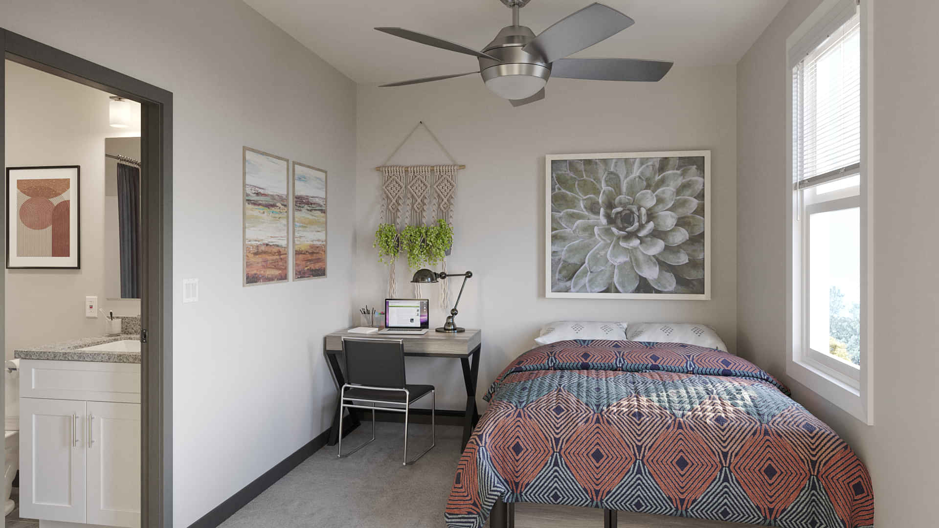 Atlas On 17th Bloomington students can find an array of apartment options including 2 Bed - 2 Bath, 1 Bed - 1 Bath, 3 Bed - 3 Bath, and 4 Bed - 4 Bath apartments, residents are guaranteed comfort and convenience. Each room is equipped with essential furnishings, including a comfortable bed and a practical desk and chair setup that creates an ideal environment for both rest and study.
