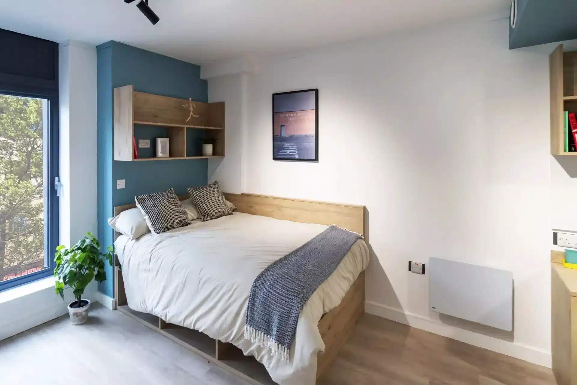 At Bradbury Place Belfast, students find modern living spaces designed for their active lifestyles. The student accommodation has various room types. These include the Bronze Studio, Silver Studio and Bronze Ensuite. This variety ensures there's something for everyone's needs and preferences. A plush double bed invites you to sink into its embrace, flanked by adjustable lighting by the bed that bathes the room in a soft, customizable glow, perfect for late-night reading or a peaceful ambience. Neatly tucked against the wall, shelving stretches elegantly, offering a home for books, trinkets, and dreams yet to be realised. The study desk, paired with a supportive study chair, forms a haven for creativity and focus, while an integrated magnetic whiteboard beckons for brainstorming sessions or pinning up cherished memories. A spacious wardrobe stands ready to organise your world, complemented by a coat hook and a gleaming mirror that adds a touch of elegance. Beneath the bed, additional built-in storage cleverly maximises space, ensuring every item finds its place. The room flows seamlessly into a fully equipped private living room area, where moments of relaxation unfold, and a compact kitchenette hums with the promise of quick meals or midnight snacks. Thoughtful touches like USB ports keep your devices charged and ready, weaving modern convenience into this charming retreat.