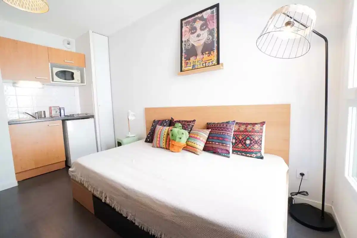 Modern and secured, this residence proposes 197 apartments, from classic studio to one-bedroom and two-bedroom apartments to welcome roommates! Consisting of a kitchenette, a study area with a desk and storage, a sleeping area with available bed linen and a private shower, accommodations are all fully furnished and equipped. The rent includes Internet, a linen kit, common charges, cold and hot water, and heating. Concerning the shared apartment, electricity is included in the rent.