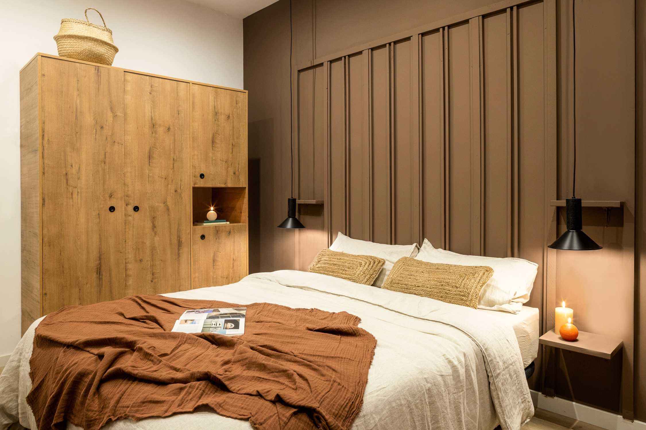 Ebro, 100 sq meters, has 3 bedrooms and 2 baths in Gràcia. It showcases an elegant and rustic design with its use of earthy tones and different green hues and it’s wood decor.