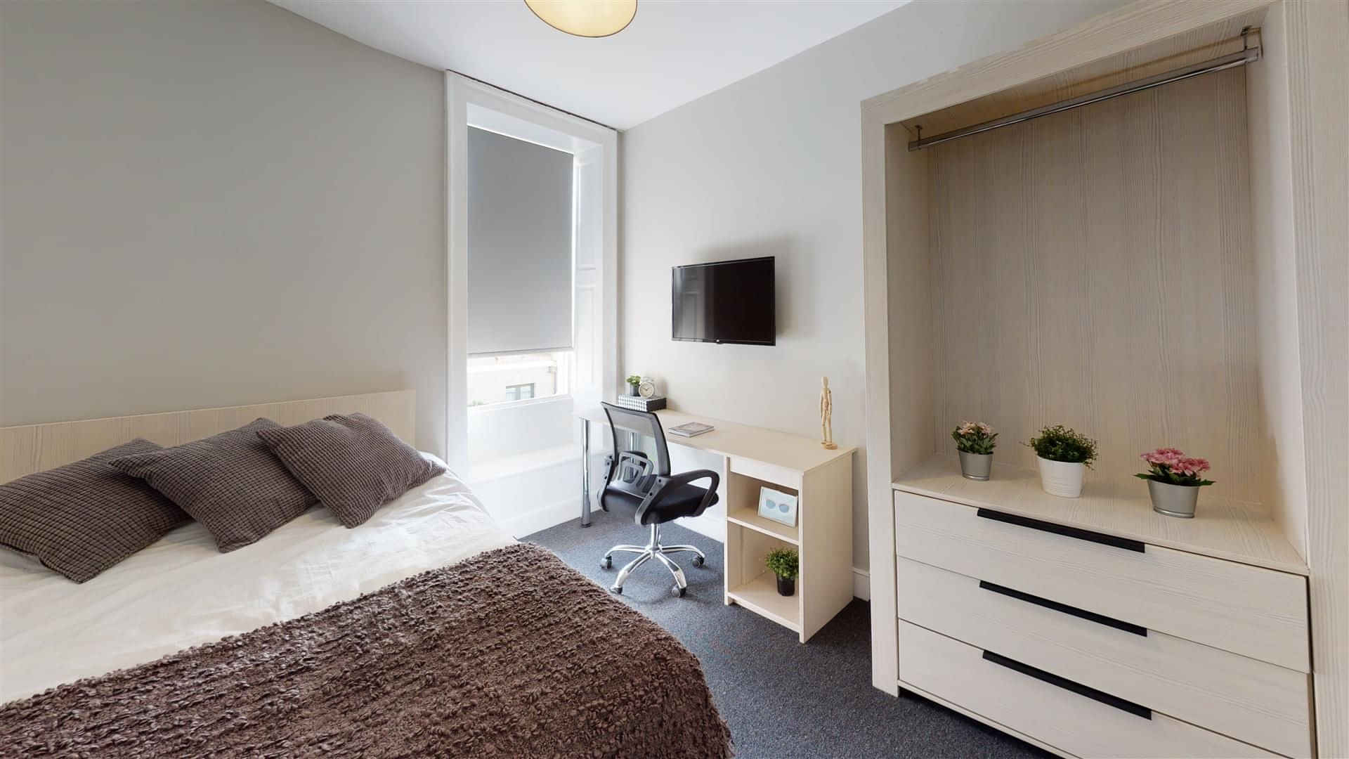 Enjoy the convenience of a private bedroom in an 11-bed apartment, featuring a double bed, a study desk and chair, a dresser, and shelves on the wall for additional storage. Natural light streams through the window fitted with blinds, creating a warm and inviting atmosphere. Entertainment is at your fingertips with a TV in the bedroom. The shared bathroom and kitchen in this non-ensuite unit are practical and designed for utmost convenience. The shared kitchen is equipped with modern appliances like induction stoves and fridges, as well as ovens and cabinets for storage, allowing you to prepare meals with ease. The apartment boasts modern interiors throughout, providing a contemporary aesthetic. In addition to the private bedroom amenities, the living room encourages social interactions with sets of sofas, a giant TV, and a coffee table. The super-fast broadband ensures seamless connectivity. Outside, a great social garden offers a refreshing retreat from academic stress. This thoughtfully designed space combines comfort with practical elements for a harmonious living experience.