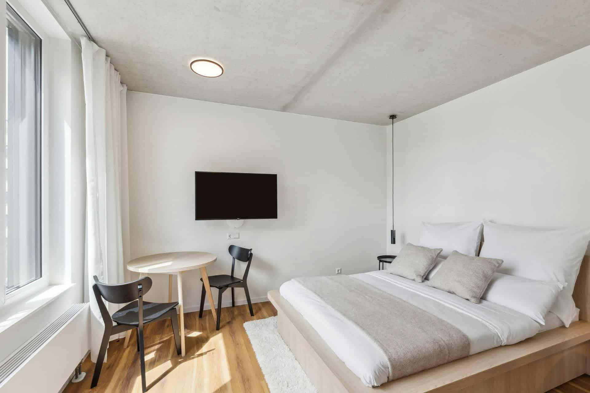 All studios are fully equipped with everything you need to feel right at home. Enjoy the many amenities at your disposal, including a fully equipped kitchen, a comfortable bed with a premium mattress and bedside tables, an ensuite bathroom, and a versatile area with a table and two chairs, perfect to work or dine. While regular cleaning is not included, it can be booked upon request.