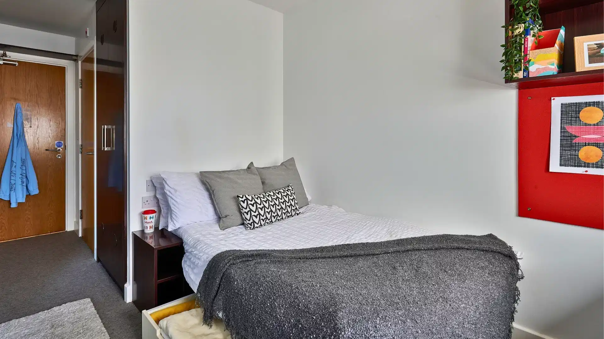 In Heantun Point reviews, students mention having a great stay during their student days. You can choose to live in a Classic En-suite, an Accessible Classic En-suite, or a Premium En-suite. Each comes with its own set of amenities, so you can choose the one you like. The rooms are furnished with a double bed, a wardrobe, a bedside shelf, drawers, and underbed storage. Your workstation includes a large desk and chair, bookshelves, and a noticeboard.
