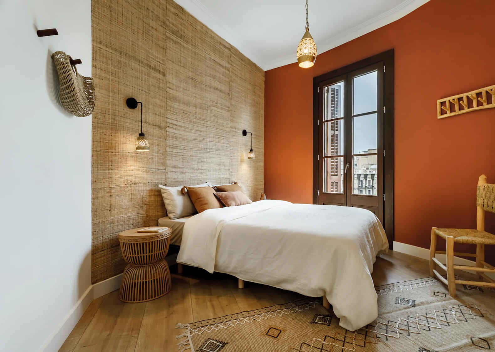 Enjoy a unique and stylish lifestyle at Hidalgo’s two-bed, two-bath apartment in Eixample Dreta. The distinctive wood decor and bold colors create a unique atmosphere that sets this housing apart from others. The first private bedroom, fitted with a queen-sized bed, comes with a small balcony for your morning coffee rituals and sunset shots. The ensuite bathroom is equipped with a full shower and brand-new towels. The second private bedroom contains a comfy bed and a roomy wardrobe along with an ensuite bathroom and also comes with air conditioning. Moving through the entrance, you'll come across a spacious hallway featuring a custom-built desk crafted from recycled wood. The shared living room, bathed in natural light, is complemented by air conditioning in summer and a heater in the winter. The couch and coffee table facing the Smart TV, provide a comfortable space to unwind after classes or an exciting night out. The roomy kitchen features a fridge, oven, coffee maker, utensils, cabinets for storage, and a dining table with 2 chairs and a bench, perfect for shared meals between friends and neighbors. Cleaning up is no hassle with the convenient dishwasher and cleaning supplies already stocked. The flat also provides a dual workspace, consisting of two big study desks, chairs, and night lamps, perfect for academics and working from home. Forget laundromat troubles with the in-unit washing machine, so defeat your pile of clothes while blasting your favorite songs from the Bluetooth speaker, and the iron/steamer will take care of them afterward.