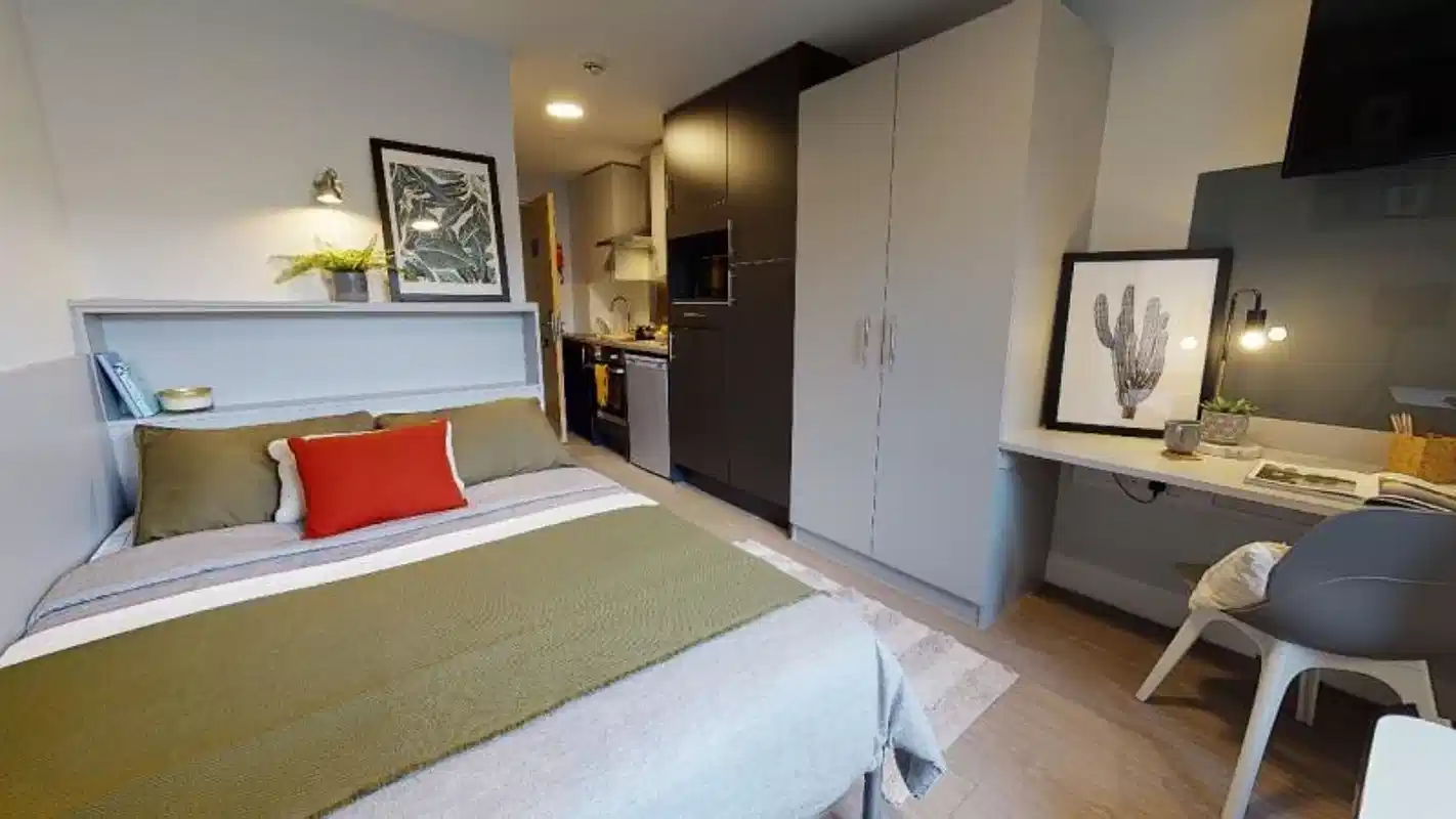 These are equipped with an oven, hob, microwave, fridge and freezer, a dining area and lounge. These rooms are popular with new students and encourage social interaction with other residents. Studios – their studios are self-contained, with integrated kitchen facilities and a living area. All have a bed, study area with good lighting, storage and an en suite shower room with shower, washbasin and WC. Studios are popular with students seeking more privacy, but still enjoy the use of all the onsite facilities and social areas.