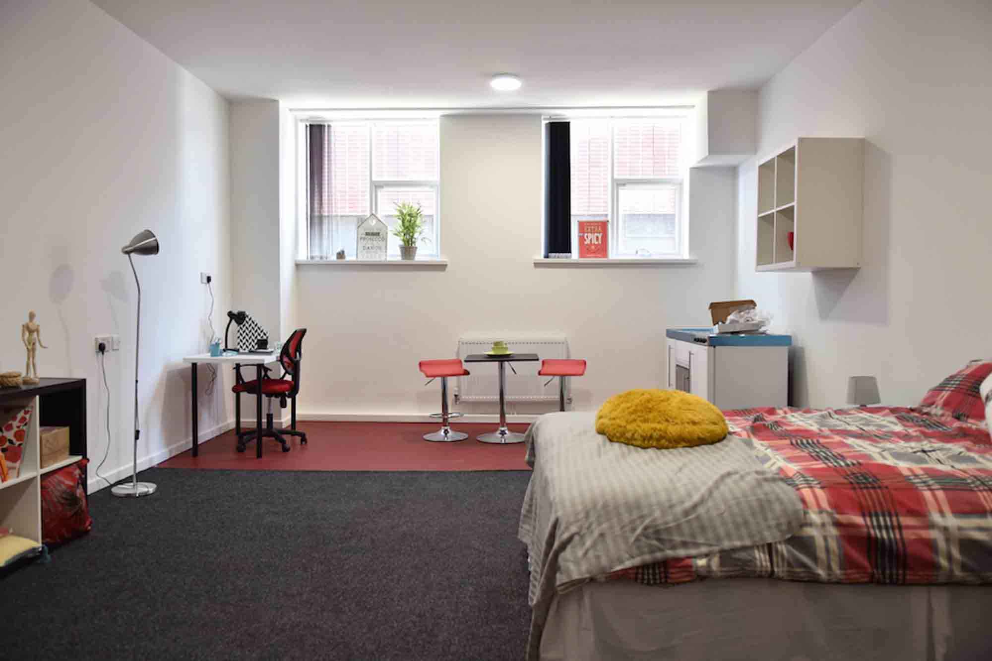3. Studio Apartments: Perfect for students who prioritise privacy and independence, studios come fully equipped with a personal bedroom, bathroom, and kitchenette. This self-contained unit allows you to live at your own pace without sharing facilities. Studios are especially popular among postgraduate students or those who prefer a quieter, more focused living environment.