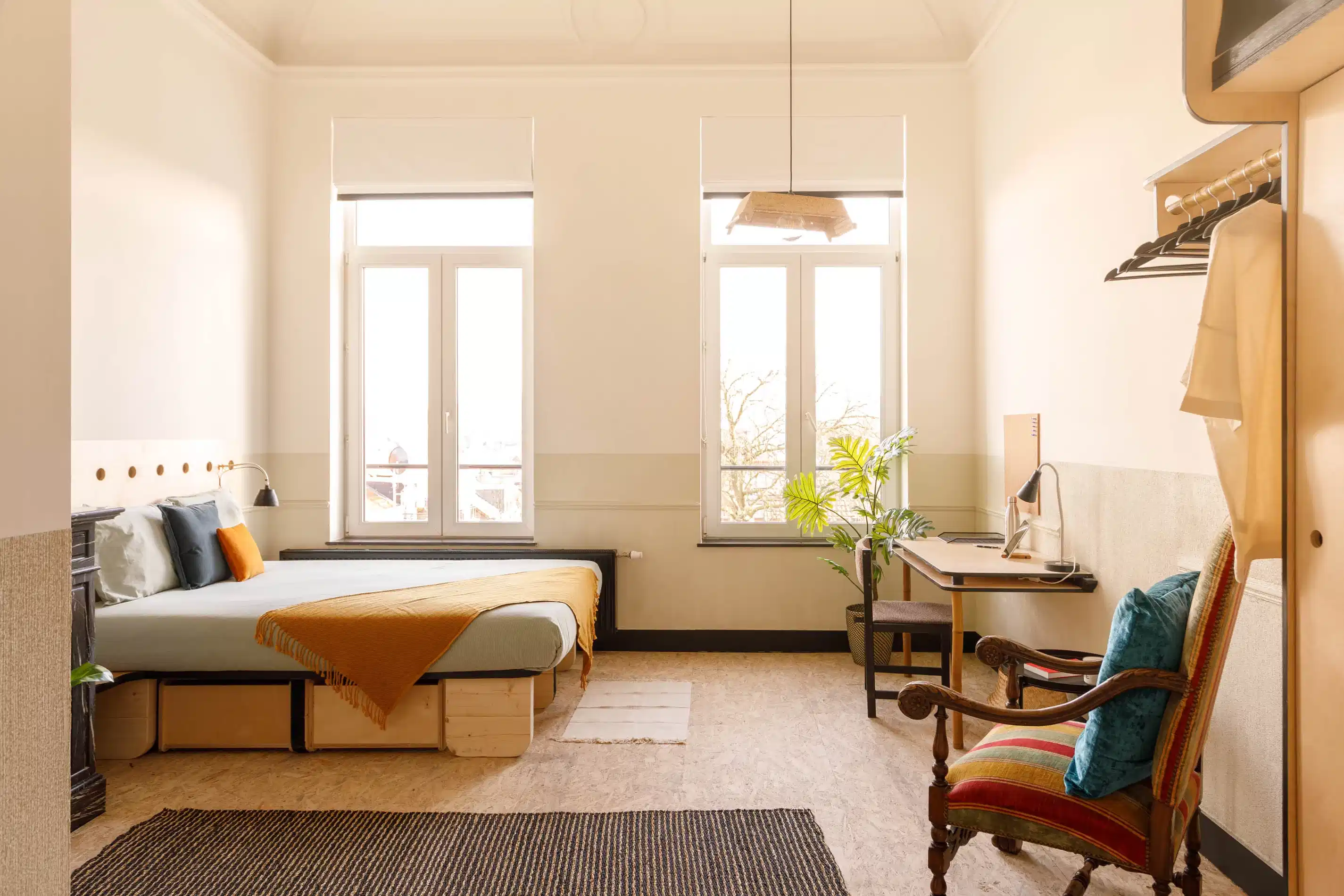 Their standard bedrooms have a queen-sized bed (140x200), a desk with chair, a bedside table with lamp, a custom-built closet, and private storage. They have a diverse range of bedroom types including:
