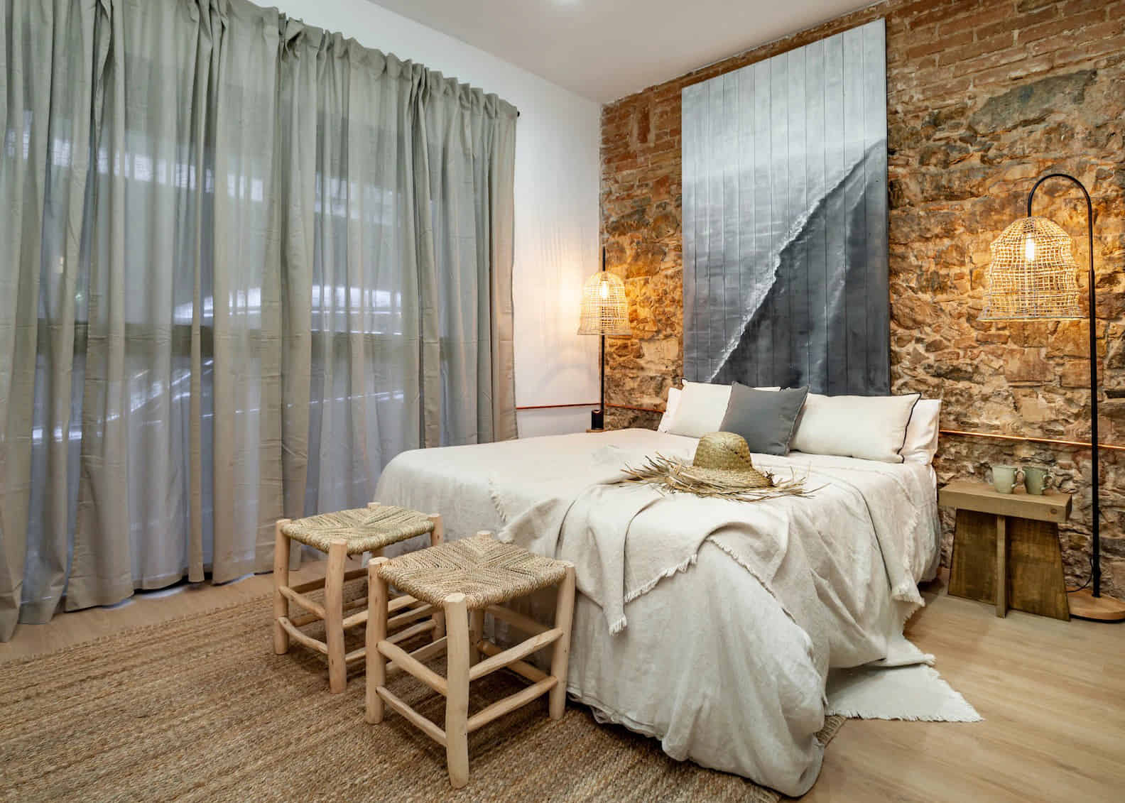 Malang is a 110-square-meter apartment with a 2-bed-2-bath flat nestled in Barcelona's Gràcia neighbourhood. The first ensuite bedroom boasts a queen-sized bed against an exposed brick wall, leading to a stylish walk-in closet and a full shower bathroom. An artistic office area with a custom desk sets the scene, accompanied by a second bathroom with a full shower. The open, modern kitchen is fully equipped with an oven, dishwasher, microwave, fridge, and cleaning supplies, while the second bedroom offers a unique ambiance with bedside lamps and ample storage. The living room, adorned with a distinctive hanging chair and a Smart TV, seamlessly connects to the 30-square-meter terrace, featuring outdoor dining and lounge areas. This pet-friendly haven accommodates 2 to 4 people, providing Bluetooth speakers, and essential amenities like air conditioning, a hairdryer, a heater, and a washing machine for a delightful Barcelona stay.