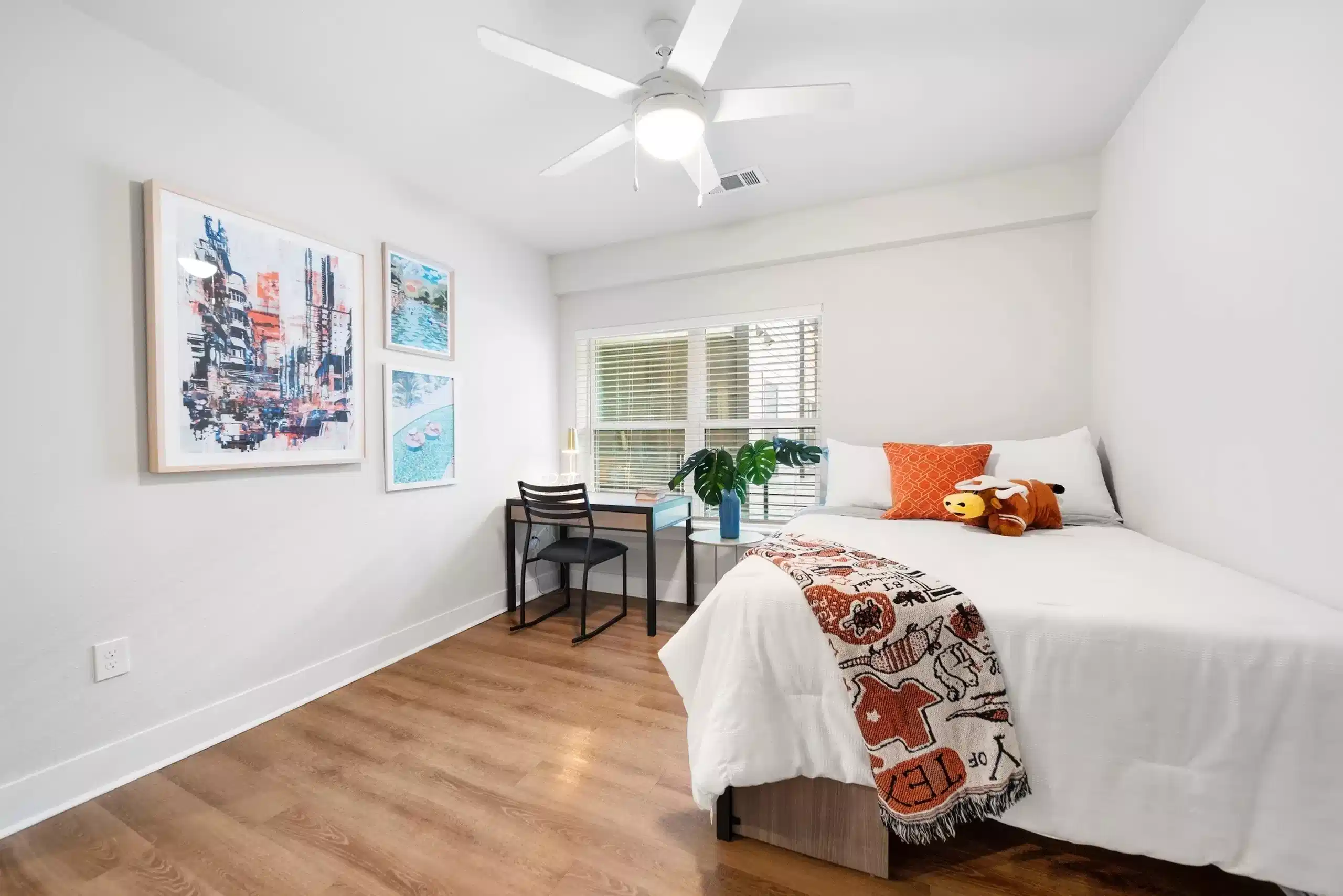 The Noble 2500 apartments are designed to meet every student’s needs. Room types range from the spacious 4x4 A layout - 4 bedrooms & 4 bathrooms to the efficient S1 studio, with floor plans reaching up to 1,392 sq. ft. Each apartment at Noble 2500 Austin is fully furnished & built for comfort & style. Common features include hardwood-style flooring, walk-in closets, an in-home washer & dryer, USB outlets, ceiling fans in living & bedroom areas, & custom cabinetry. You’ll also find quartz countertops, kitchen tile backsplashes, & undermount stainless-steel sinks with garbage disposals. Every bedroom includes a window for natural light, & each apartment comes with a SMART TV in the living room, gigabit internet, & a full-size memory foam bed, making it easy to feel right at home.