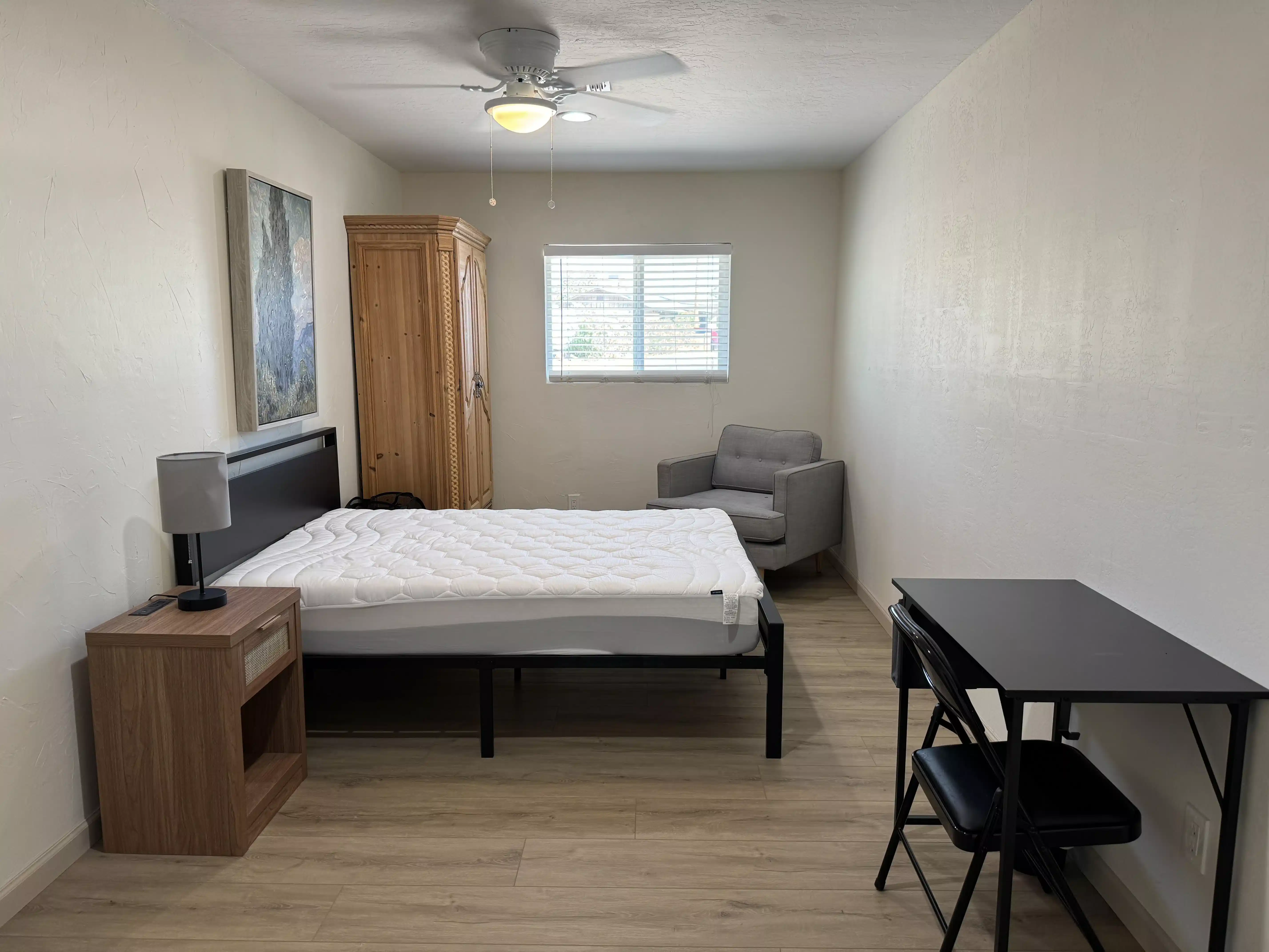 Come move into a comfortable clean room in a quiet location today! This newly-renovated home is in a quiet neighborhood but very near the Red Mountain freeway and main access roads. Each room has a comfortable bed as well as nightstand with USB ports for your convenience. The kitchen comes equipped with a fridge, sink, oven, microwave and stovetop.