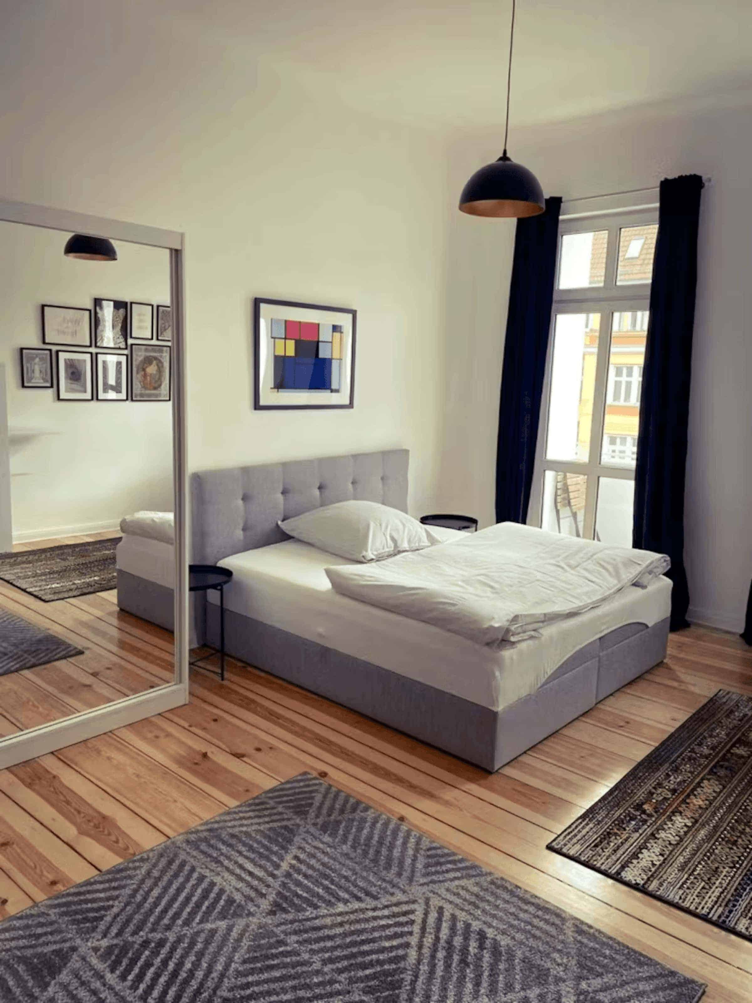 We are a start-up committed to solely hosting ambitious successful young professionals aged 21-35. We believe that hosting like-minded go-getters is essential for a pleasant flat atmosphere. With your relocation to Berlin to one of our luxurious co-living spaces, you will get direct access to an elite community of carefully selected individuals. You will instantly be integrated into Berlin’s social circle of bright rainmakers. Renting a room with us can be compared to joining a selective membership club. Ultimately, our mission is to provide aspiring personalities like you, who are newly drawn to Berlin, with prompt communal cohesion and moreover an extensive network of thriving achievers. Not just within your own co-living space, but also beyond your flat. On a periodical basis, we organize events, where tenants from different co-living spaces come together to enjoy an exciting evening and are moreover given a platform to network and bond. These events can be in form of fancy restaurant dinners, exclusively catered house parties, long weekend lunches or even personalized pub crawls. Of course, with pleasure, we carry all costs of our highly valued get-togethers. Regarding living comfort, we have established a new level of luxury in the co-living space segment. All our flats are equipped with the finest furniture highlighted by kingsized box-spring beds, modern fully fitted kitchens as well as all necessary appliances and utensils one might need in an apartment. Every flat of ours has been individually furnished with an eye for warmth and detail. Furthermore, we only choose prime locations for our apartments. Our shared flats can primarily be found in Berlin's most fancy and central residential area: Westend. With us, the rent you pay is an all-inclusive rent. No headaches, no subsequent payments, or hidden costs. Everything is included: electricity, very fast 100 Mbit/s internet, water, heating, and washing machine costs. You also don’t have to worry about any administrative TO DOs like city registration for example. We will take care of everything. Moreover, we offer a 24/7 Community Member Service for any issue that may arise, may it be a simple restaurant recommendation, city bureaucracy questions, or any form of personal emergency. We carefully select every member of our community and thus fully trust them; this is also why we are the only co-living player on the market that does not require a deposit. We believe that our non-deposit policy liberates our clients from unnecessary financial burdens and gives them more flexibility within their fast-paced career lifestyles. The room is 25 square meters in size and particularly bright. The room is equipped with a king-sized box-spring bed with fine bedding as well as two bedside tables, a chest of drawers, a large mirror, a working desk with a corresponding chair, a floor lamp, and a large closet. In addition to your own room, you and your (hidden) share an open living space with a spacious kitchen, a couch, and a dining table. Moreover, the kitchen is fully fitted with cooking equipment and utensils. Furthermore, you can enjoy a luxurious bathroom with a chic mirror sink. The room is located in a very beautiful and well-maintained old building in the middle of the exclusive Berlin district Prenzlauer Berg! Ideal for interns and young professionals, it takes only a few minutes by foot to the Schönhauser Allee underground station. More central is hardly possible! In addition, the district not only impresses with its central location but also with its special charm and spirit. Restaurants and bars are within walking distance.