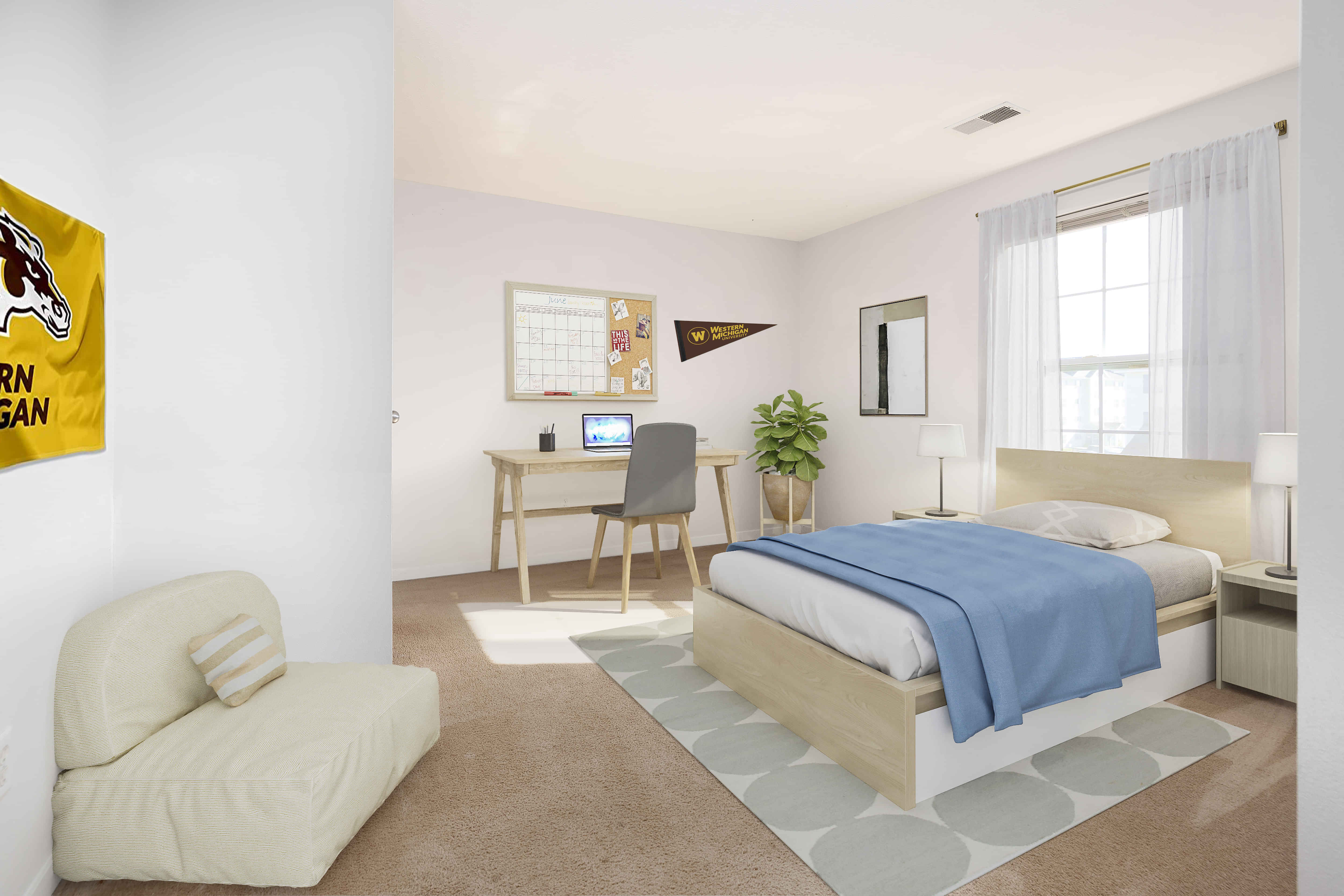 Private rooms in Kalamazoo student apartments typically include a bed, study desk, and sometimes a private bathroom.