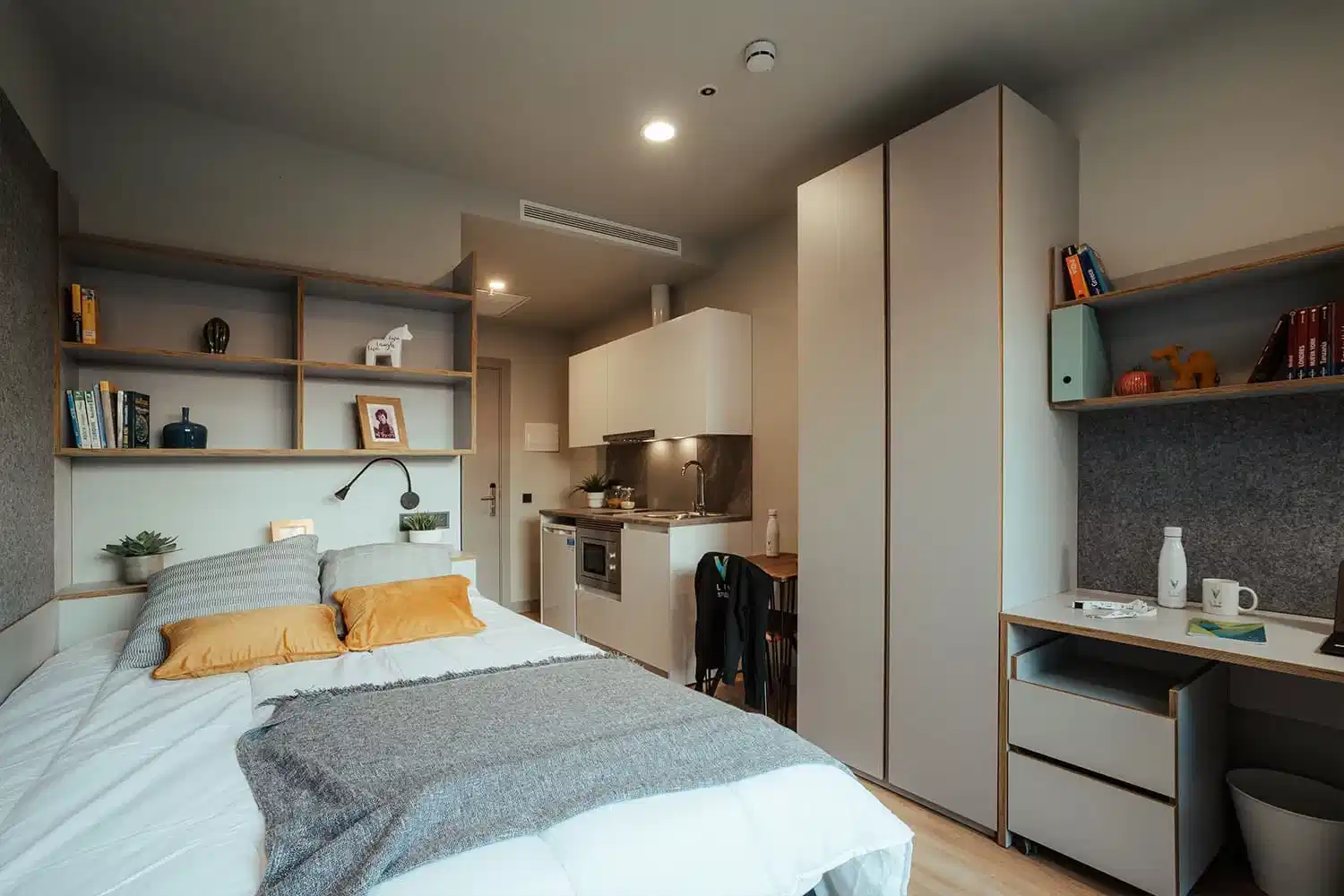 A studio is a self-contained unit with a bedroom, a kitchen, and a private washroom. Two students may book a single studio together, subject to the policies of the accommodation provider.