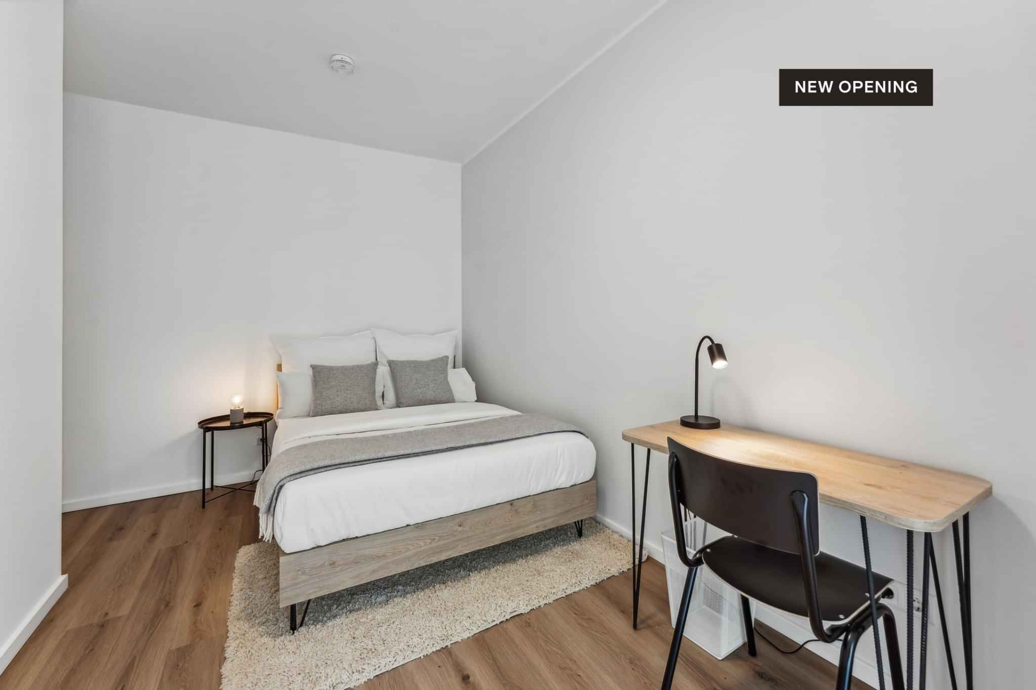 3. Your room also awaits, fully furnished and clean! You will find a bed and bed linens, a bedside table, and a wardrobe in your room. If you book a room larger than 10m2, you also get a desk and a chair. All you need to do is pack your clothes and move into your new property home! Some buildings offer a shared laundry room and others a washing machine inside the flat.
