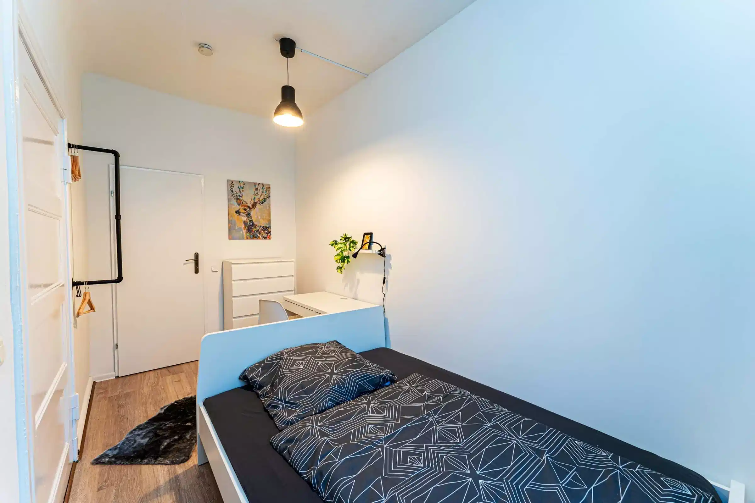 This shared apartment at Sterndamm 75.5, Berlin offers a comfortable and well-furnished private room within a modern five-bedroom flat. The room is about 8 m² and comes equipped with a bed, desk, chair, and wardrobe, making it ideal for students or young professionals. The apartment spans 82 m² and includes shared common areas such as a fully equipped kitchen and washing facilities.