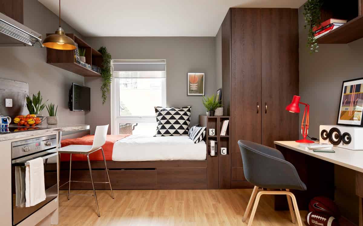 Student Castle Lincoln reviews are great, and students have really loved it here. There is a wide range of units designed to cater to your needs and budget. You can choose from a Giles apartment (2 bedroom) to a Harrison studio. A comfy double bed will be waiting for you at the end of the day. You get plenty of storage space with a fitted wardrobe. To get you through your studies and exams, there is a study desk available.