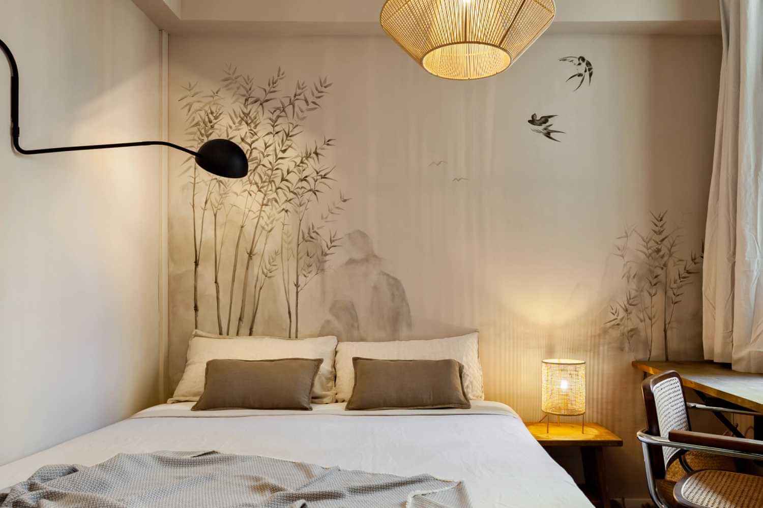 One of the highlights of the apartment is the hand-painted mural on the bedroom wall, evocative of nature and tranquility. The bathroom, near the entrance of the apartment, has a full shower. All bed and bath linens are provided.