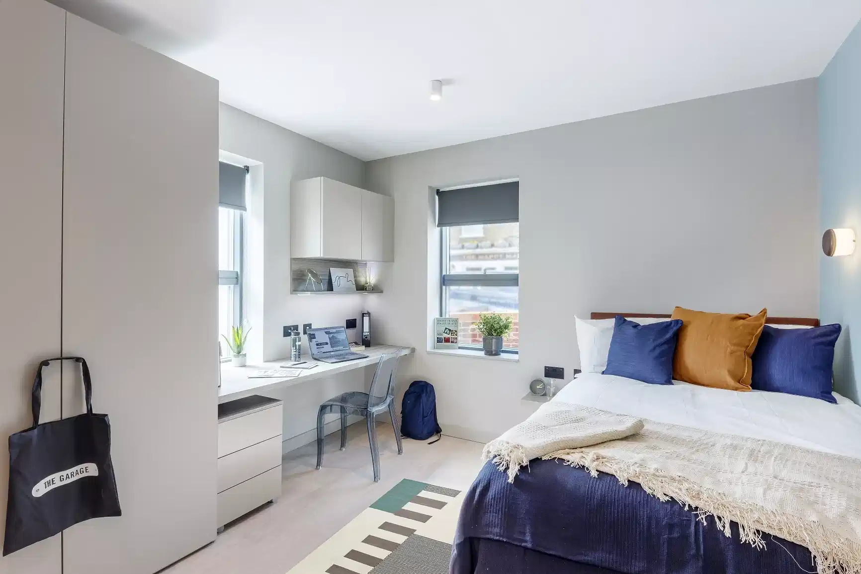The rooms at The Garage Egham student accommodation such as Premium Studio, Classic Studio, Deluxe Studio, Executive Studio, and Classic and 6 Bed Premium, 4 Bed Ensuite offer comfortable and functional living space for students. Each room features a double bed with convenient under-bed storage, perfect for maximizing space. The private bathroom includes a shower for added convenience. A full-length mirror is provided, along with a study desk with drawer space and a chair, creating an ideal area for academic work. The wardrobe offers ample storage for clothing and personal items. The Garage student accommodation also includes a kitchenette equipped with a 4-ring hob with extractor, an electric oven, and a full-size fridge freezer, allowing students to prepare their own meals.