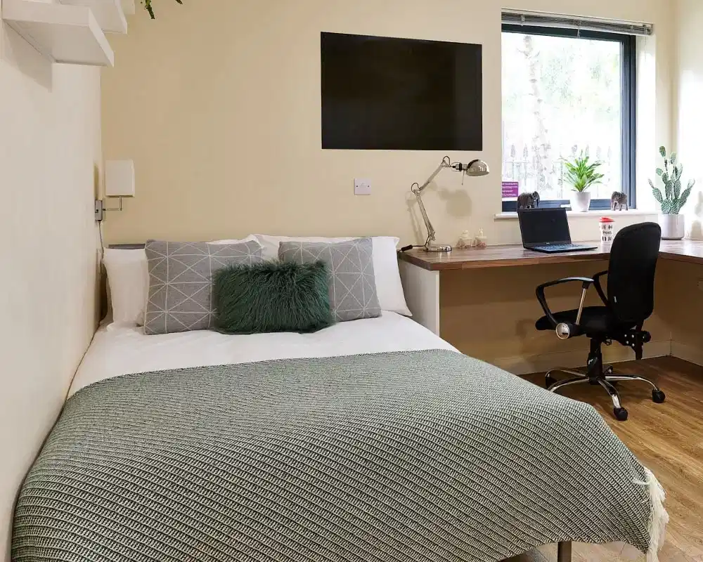 At Host The Hub, students can choose from a range of stylish studio rooms, from Standard Studio to Deluxe Studio, each designed for independent, comfortable living. Every studio comes fully furnished with a 3/4 double bed, wardrobe, drawers, and underbed storage, offering plenty of space to stay organised. The dedicated study zone includes a large desk, chair, bookshelves, and a noticeboard, perfect for keeping notes and assignments in order. You’ll also have a private en-suite bathroom and a modern kitchenette fitted with a fridge/freezer, combination oven, and induction hob, giving you everything you need to cook and unwind in your own space. High-speed free Wi-Fi & wired internet (100Mb) and Freeview TV make studying and entertainment seamless, adding to the convenience of living at Host The Hub.