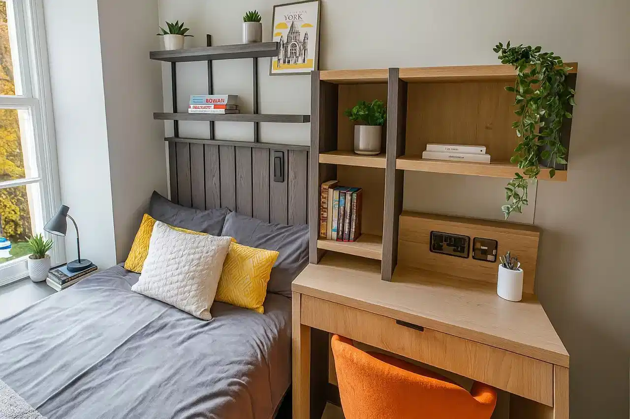 The Port On The Square Bristol furnished rooms are designed to provide practical and comfortable living environments. The ensuite rooms feature private bathrooms with shared kitchens, allowing students to enjoy privacy while still experiencing shared living. The studio apartments (15.5–17.8 sqm) offer entire place layouts with private bathrooms and private kitchens, providing complete independence. Bedrooms include a small double bed, creating a comfortable resting space for residents. Additionally, TV in every studio provides entertainment within private studio units.