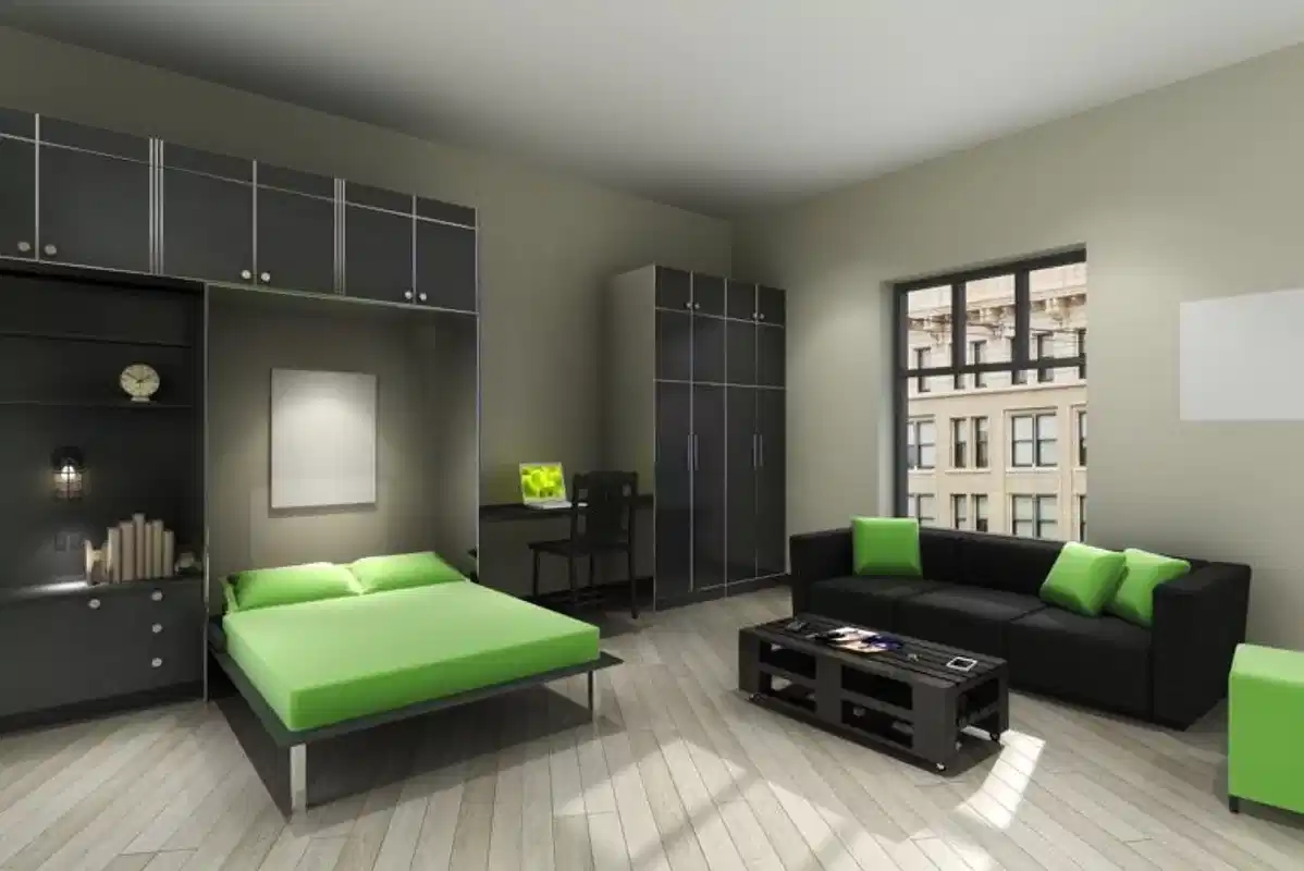 Step into a living experience unlike any other at The Sterling. The studio floor plans are extremely efficient in their use of space and material, and feature functional touches such as Murphy beds, ottoman storage, and more. The community hallways and common spaces are adorned with reclaimed materials, vintage objects, and fun signage because we think apartment living should have personality, just like the individuals that call it home!