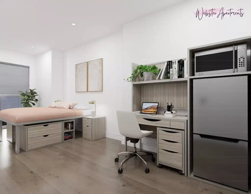 The room rate at The Webster Apartments includes all utilities (water, sewer, gas, electric, trash, high-speed WiFi, AC/heat), 24-hour on-site staff, communal lounge and study areas, as well as a communal kitchen.