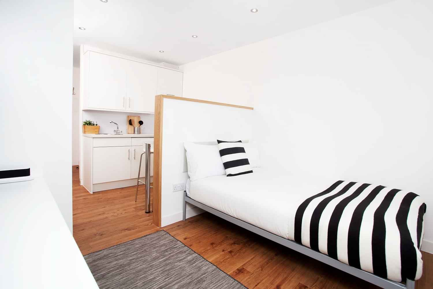 Studio flats in Glasgow are self-contained: bedroom, bathroom and kitchenette all in one unit, offering full independence.