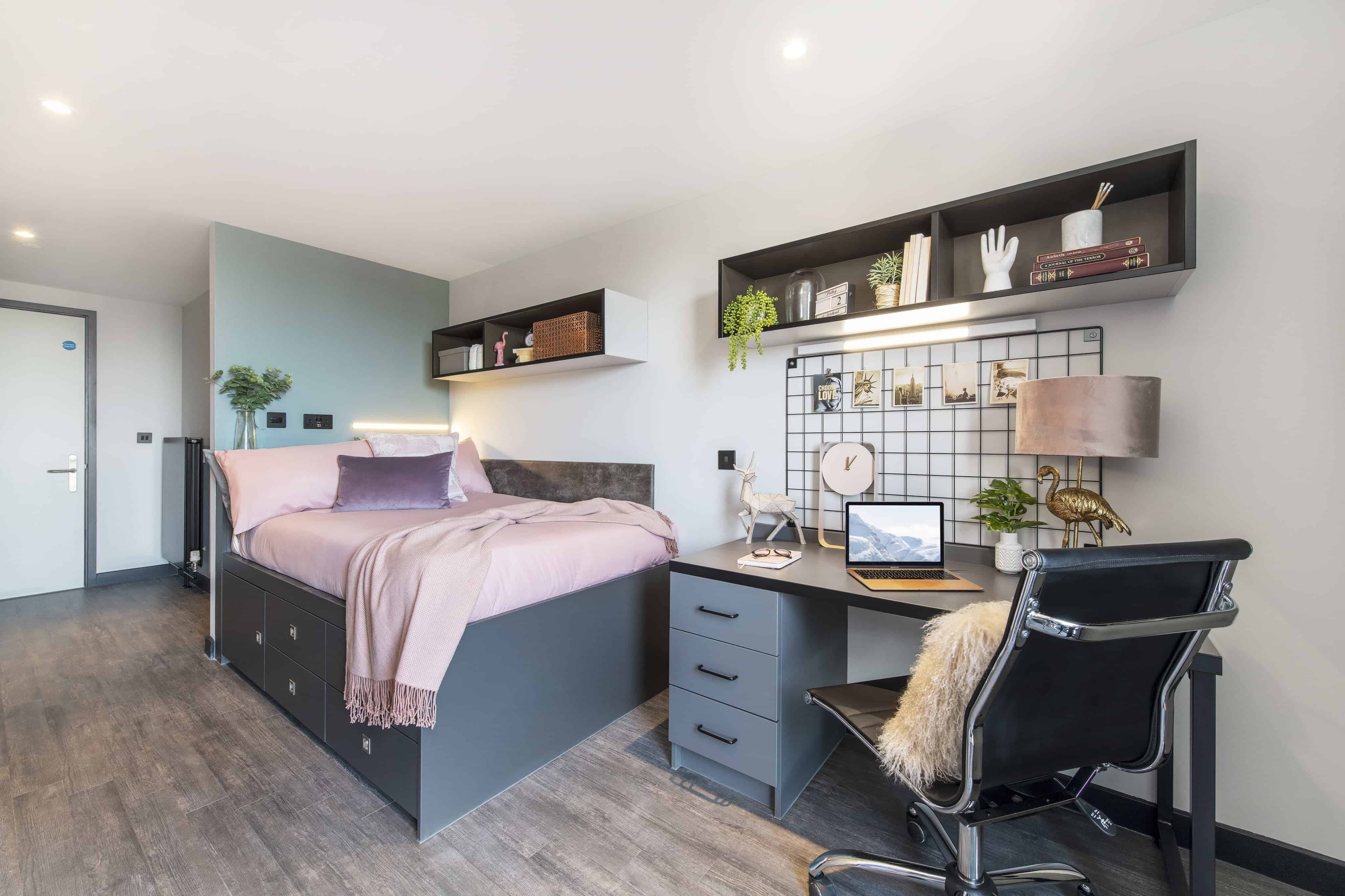 At Zenith Cardiff accommodation, students can choose from a range of options, starting from a Standard 2 Bed Apartment up to 4 Bed Apartments. All rooms at Zenith Cardiff come fully furnished & equipped with a wide range of thoughtful features. Expect 40" Smart Televisions in each bedroom (licence not included), double beds, USB chargers, en-suite bathrooms with showers, luxury adjustable study chairs, pin-boards, & ample storage space. Kitchens are modern & practical, with combination microwave/oven/grill units, 4-ring induction hobs, fridge/freezers, dining tables with chairs, & extractor hoods. These amenities vary from room to room.